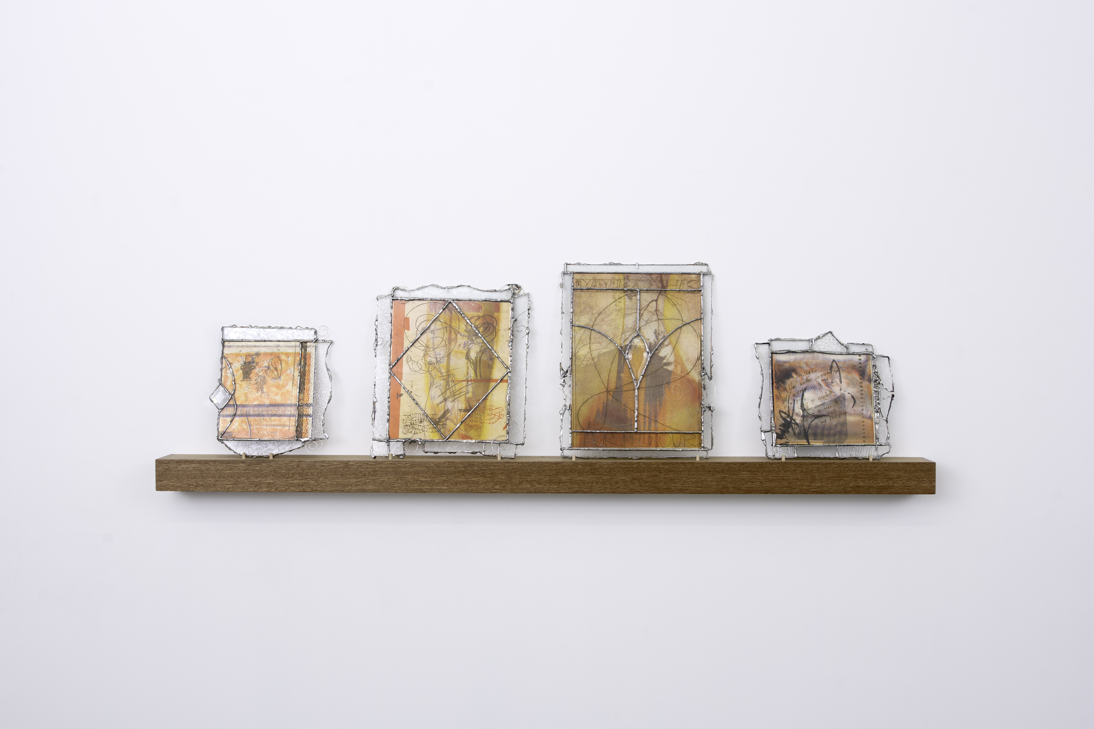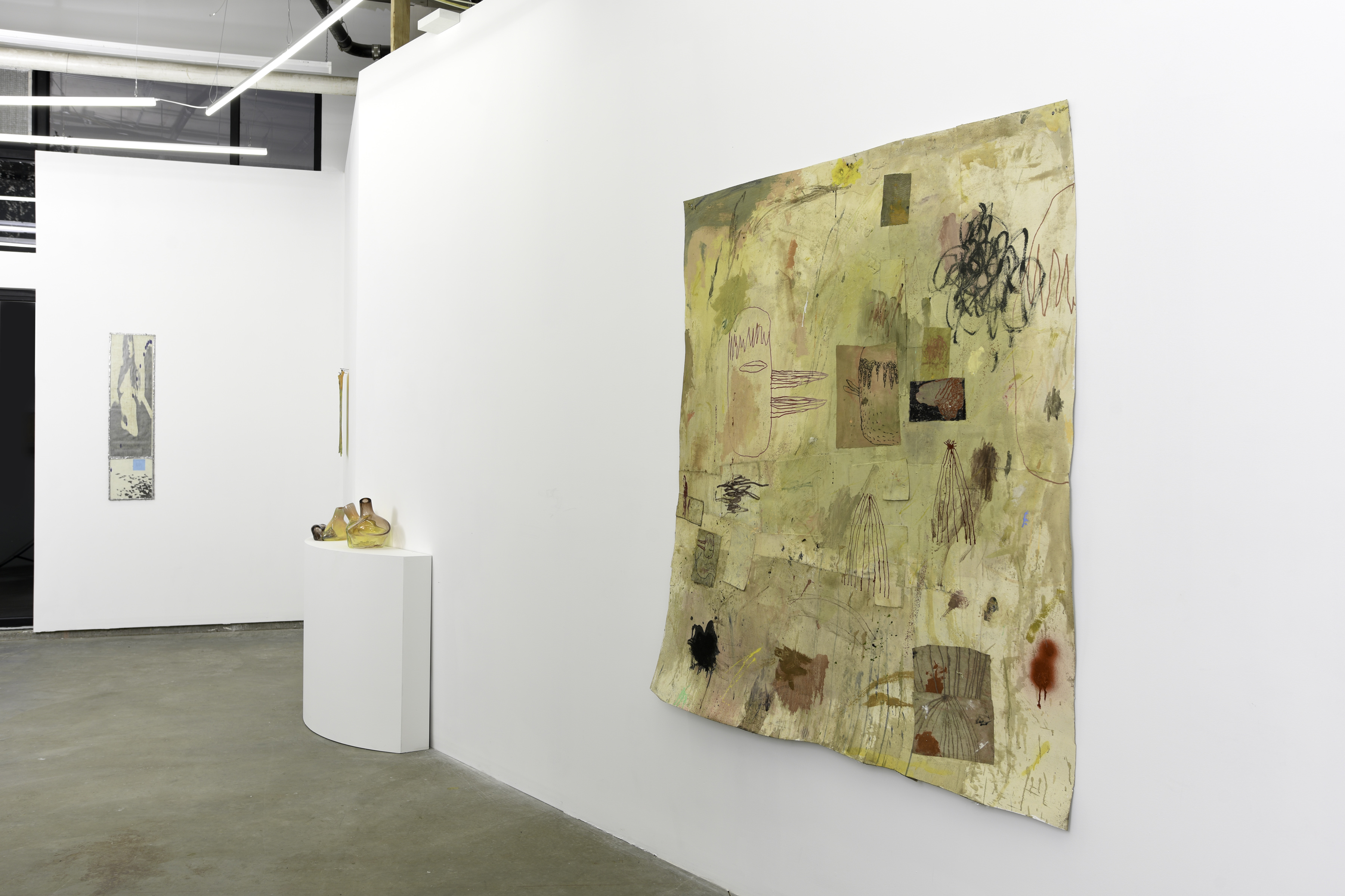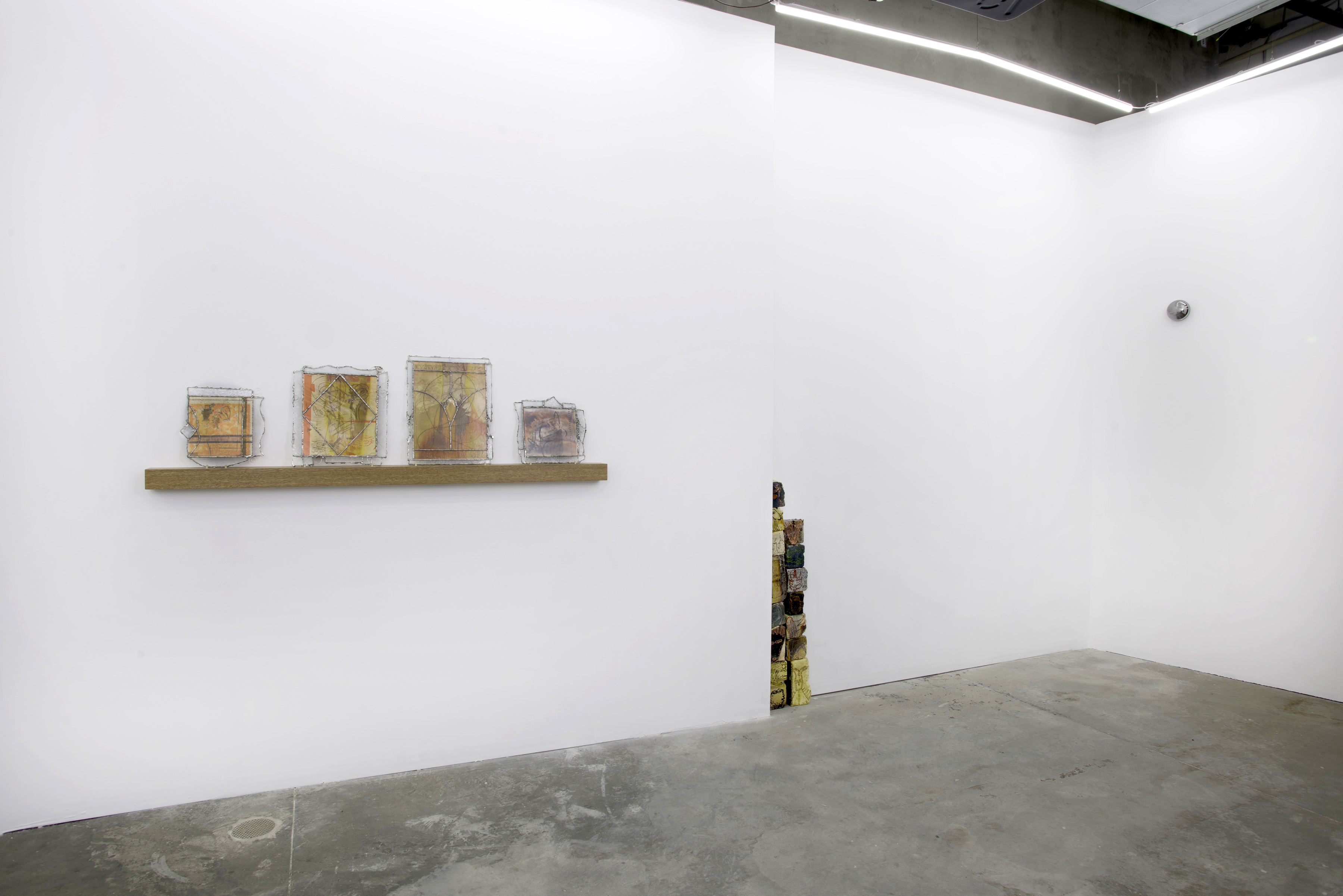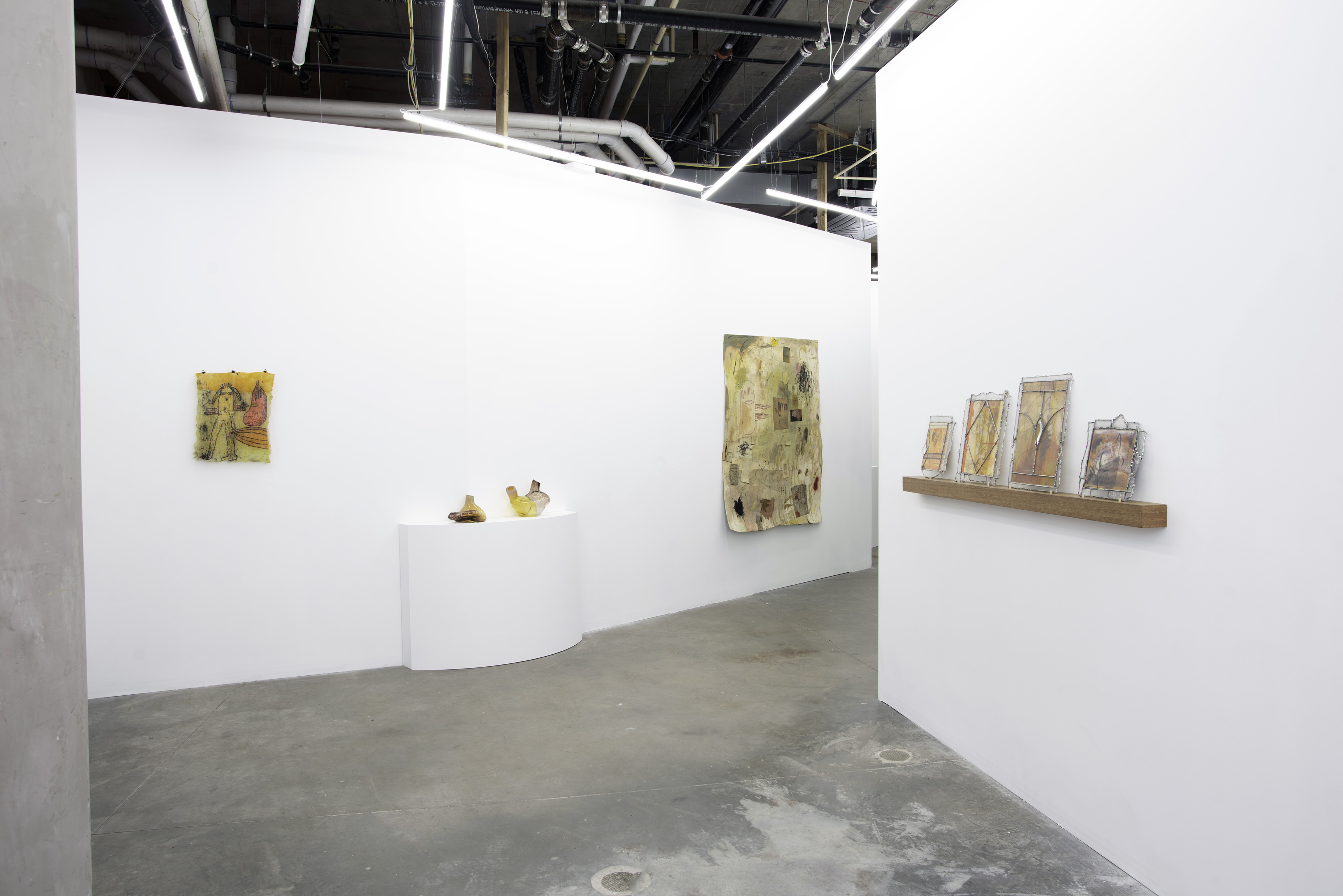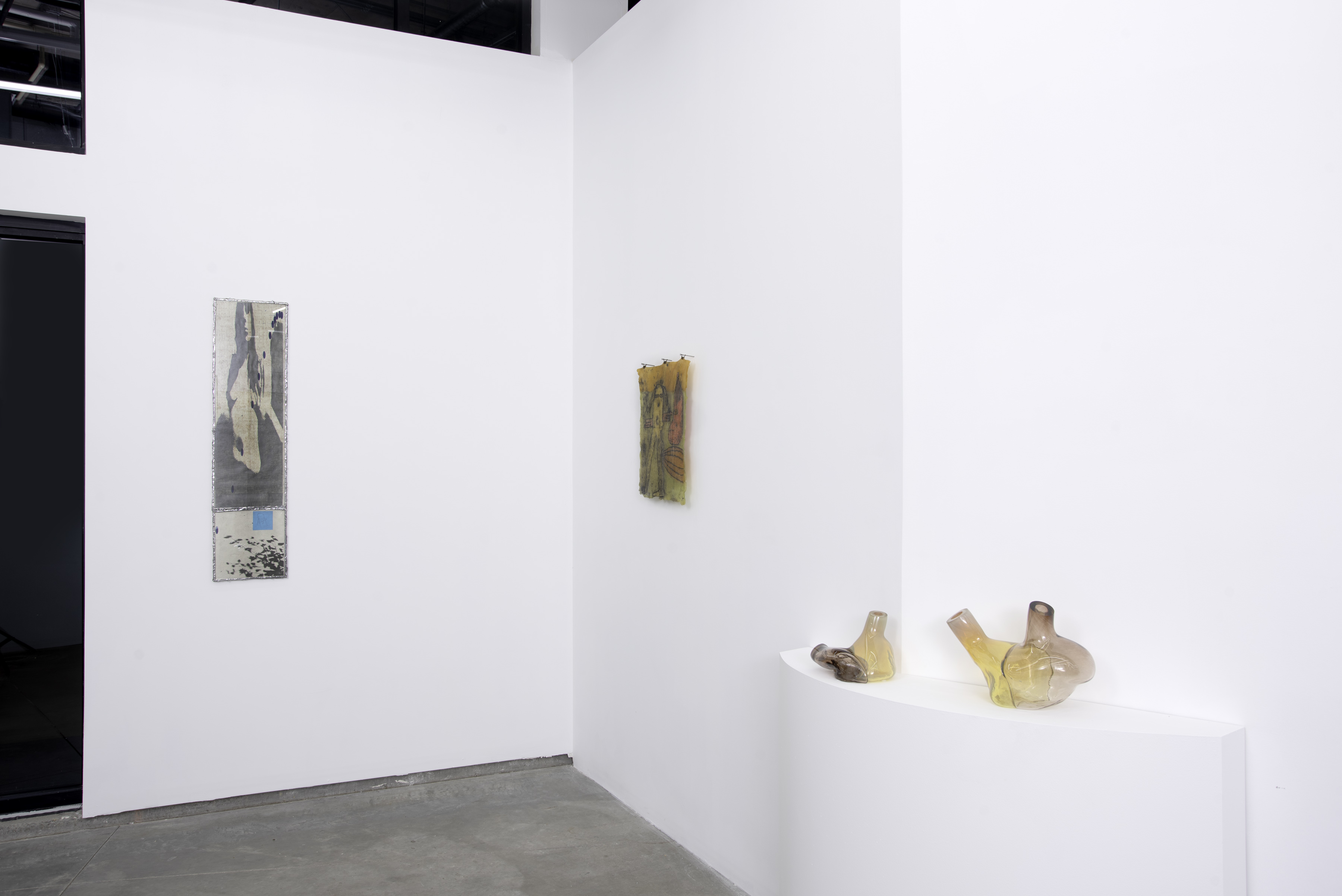 The three artists in this exhibition meld and mend via protracted material processes that coalesce into unique objects. Divorcing themselves from traditional methods and outcomes (painting, stained glass, glassblowing, printmaking), each artist leans on and into an outward-facing sense of naivete that is quickly revealed to be a honed air of careful, time consuming experimentation. They meander down a path less worn and, for lack of a better term, create messy compositions that reflect the reality of our constructed lives.