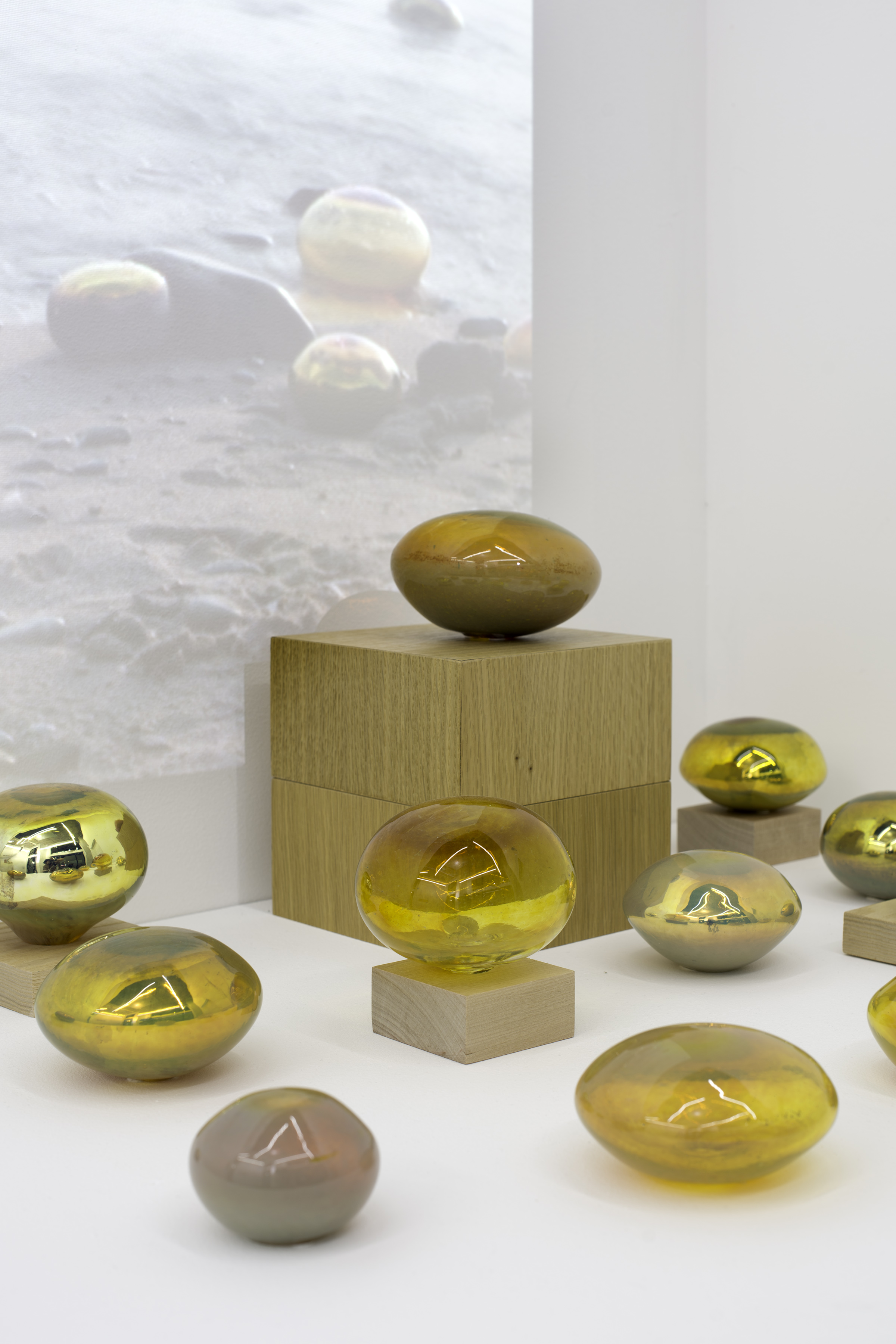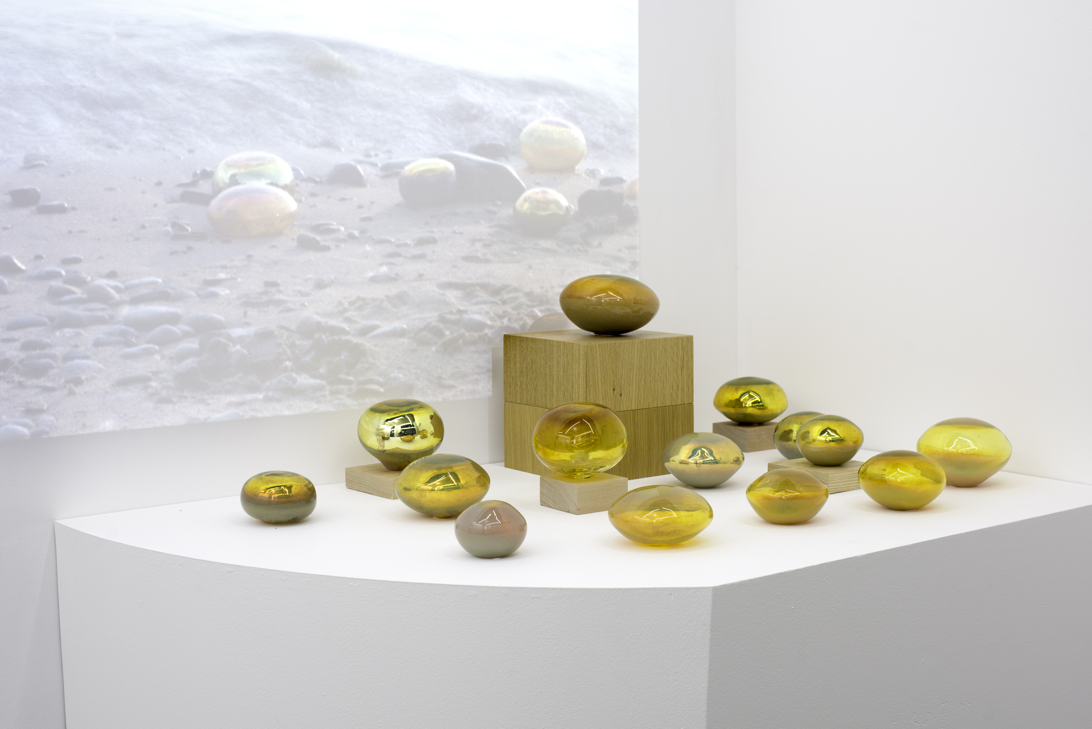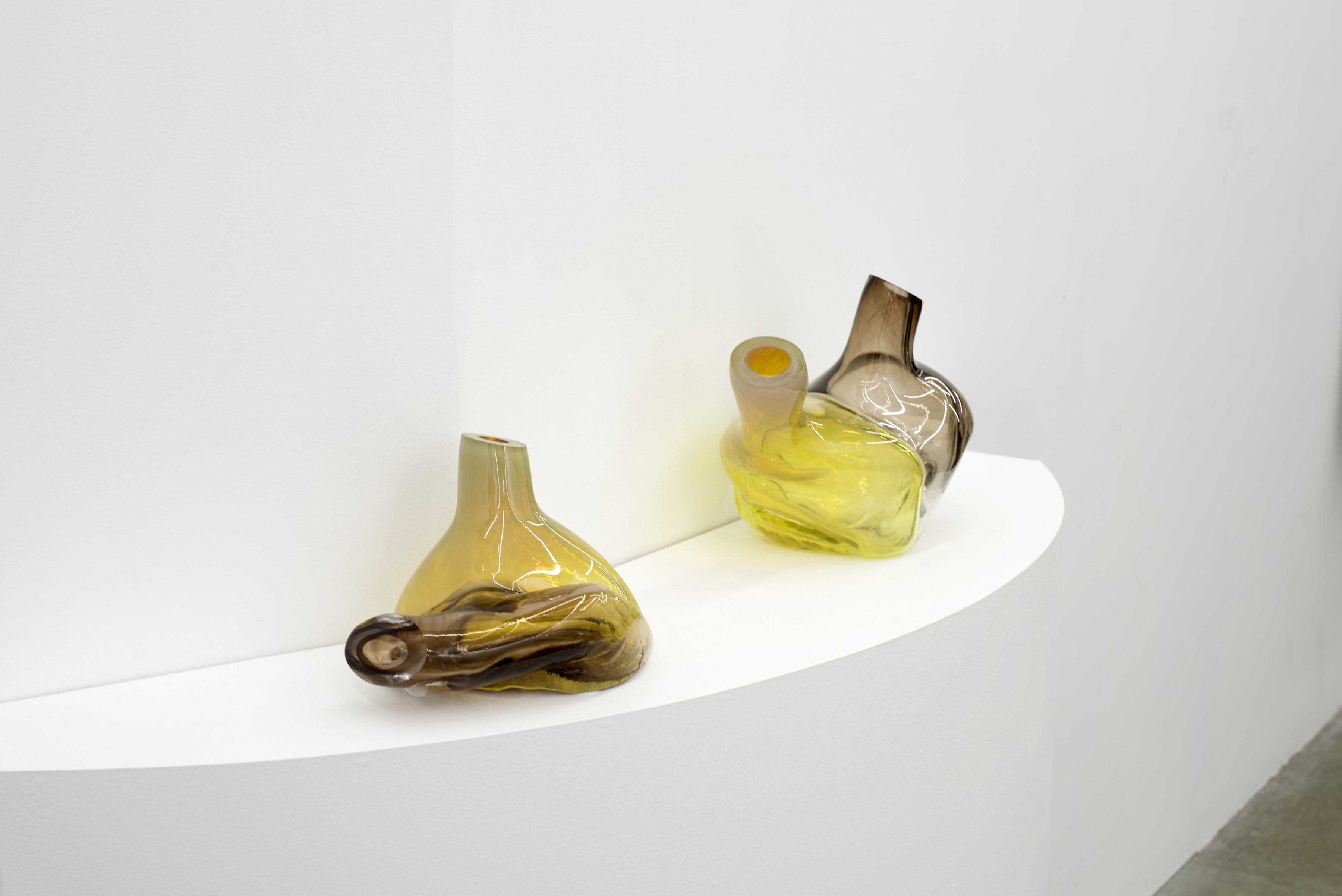Alex Blom’s recent Intimacy Collision series exemplifies their foray into glass blowing after a residency at Ox-Bow in Saugatuck, Michigan. The process requires multiple collaborators coming together to create, manipulate and then press together separate bodies into one. The results are unpredictable despite the traditions and cautionary techniques required for the work. Other glass sculptures become reflections and vessels for the sea and sky of their lived environment pressing together the sublime spaces through which we walk and exist.
