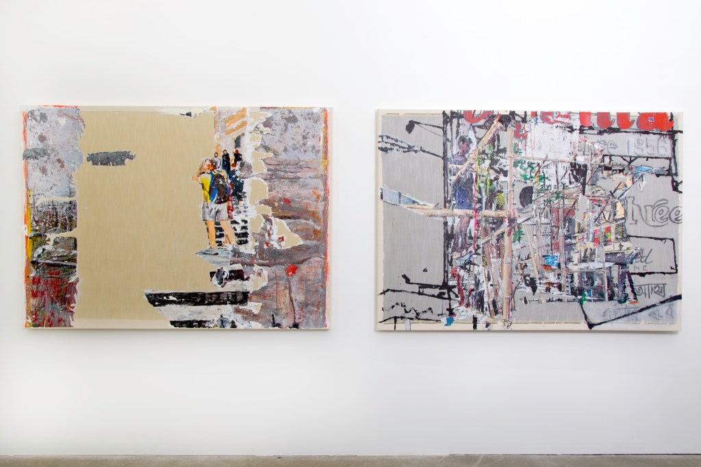 Marius Lehene’s glitched and layered paintings speak to an overload of visual information made manifest through painted decals applied to canvas. These decals consist of paint on transparent plastic allowing Lehene to utilize both the reverse and obverse image when creating his works. This unique process convolutes our perception as he mixes imagery from what he calls his “fickle sense of identity” (Romanian, North American, and Indian). Space is collapsed through competing worlds permanently invaded by other worlds as his layering effects intentionally distort any sense of reality even though his source material is in fact “real”. Deeply rooted in literary and behavioral reference, Lehene flattens virtual space and brings the tired, chipped, and slowly peeling parts of the world to the surface for us to inspect.