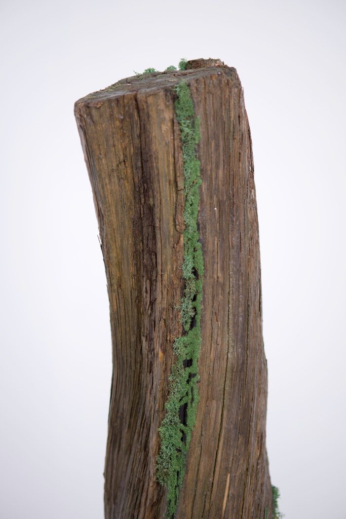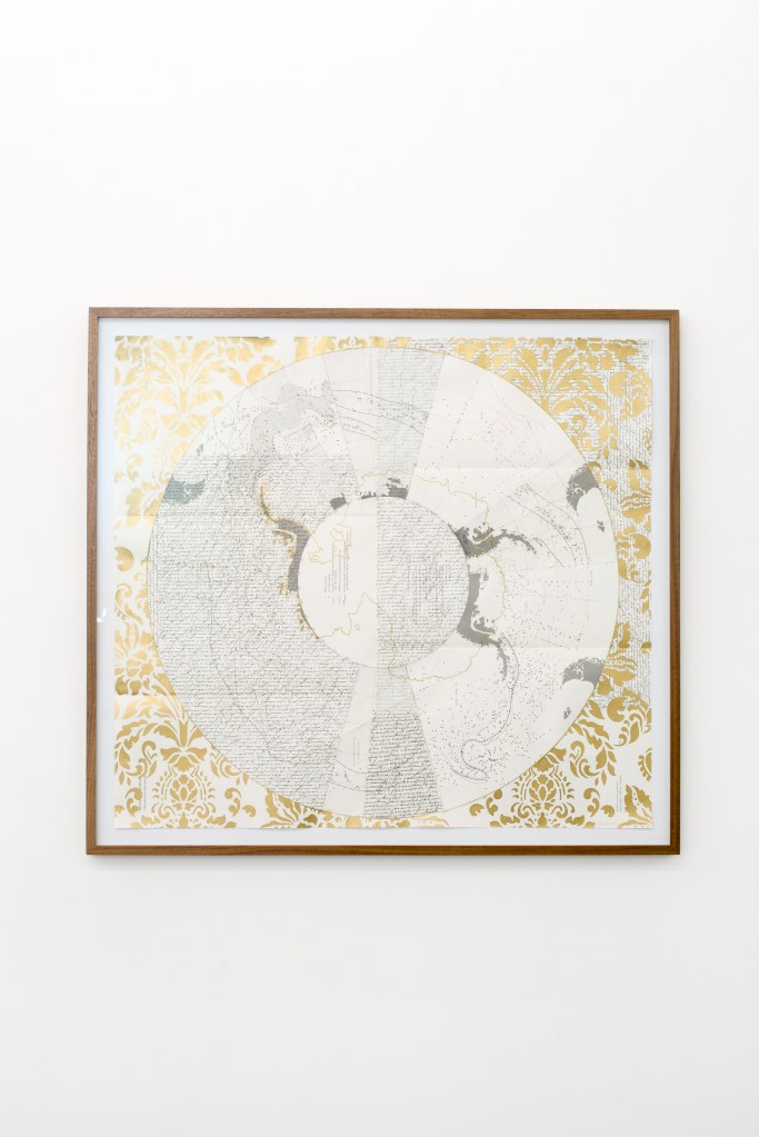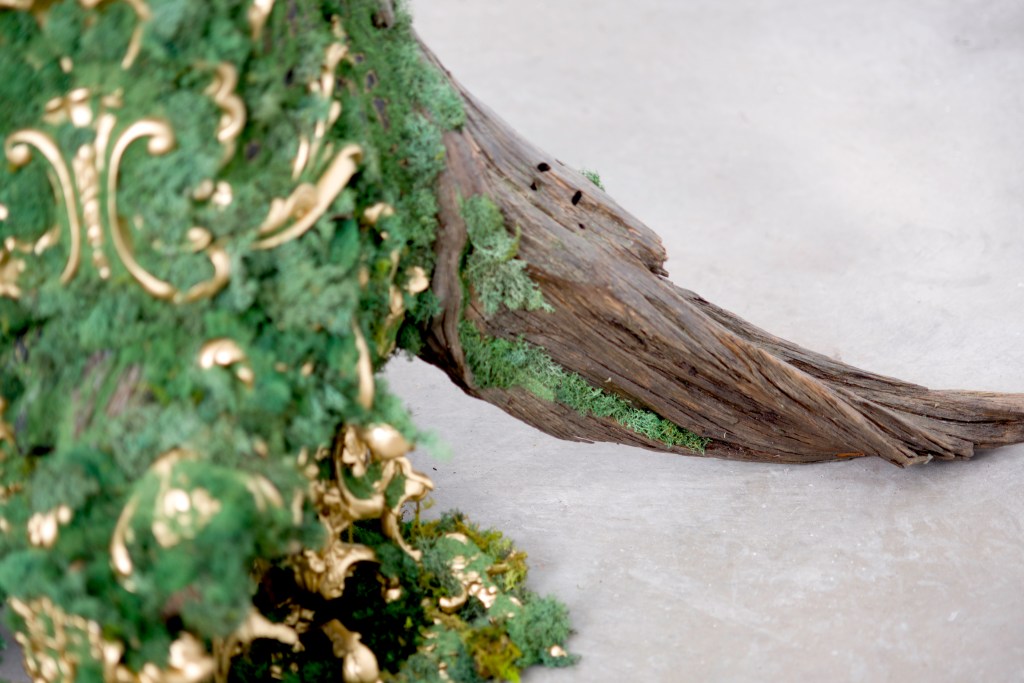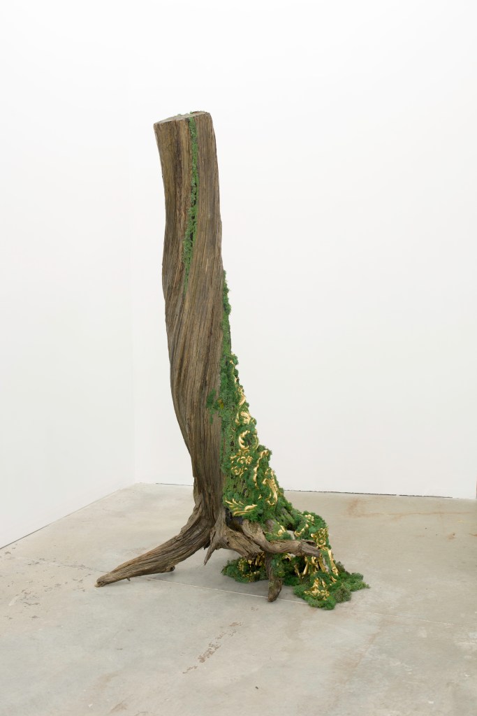 Regan Rosburg’s multidisciplinary practice employs a wide range of modes and materials by transposing symbology, ornamentation, and writing onto vintage environmental research ephemera or nature itself. These juxtapositions are not applied with a questioning paradoxical approach, but are instead teeming with purpose – a gold architectural ornament that can be bought at Home Depot is placed in the Rocky Mountains or a dead tree taken from nature is placed in a white gallery. While her intention could be read as cynical or pointedly critical, Rosburg circles back into the lineage of environmental scientists from a not too distant past that might help guide us to rediscover curiosity rooted in hope and community. In her sculpture, The Way is the Way, she mines a location of personal history to resurrect a tree that lived and died long before she was even born. Applying resin cast and manipulated gold ornamentation to the long hardened root structure of the tree as well as green moss that wraps itself around the trunk, she imagines a future of growth that reaches towards the Sun’s light rays.